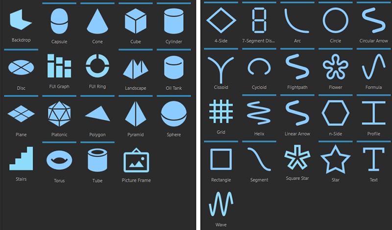 The Nodes in these categories are directly comparable to the familiar basic objects in Cinema 4D and therefore also show the characteristic blue coloring in their icons and Node header areas. These Nodes can be dragged directly into the Object Manager to create the corresponding shapes. As with the basic objects, the settings for these shapes can then be operated directly via the Attribute Manager. The Nodes can be combined as required with other generators and deformers in the Object Manager, where they can also be converted into polygon or spline objects if required.