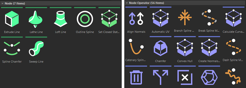 Although the green Nodes (shown on the left) are intended exclusively for use in the Node Editor, the Nodes grouped together in the Node Operator subcategory (shown on the right) can also be assigned directly to other objects in the Object Manager, where they provide various modeling functions.