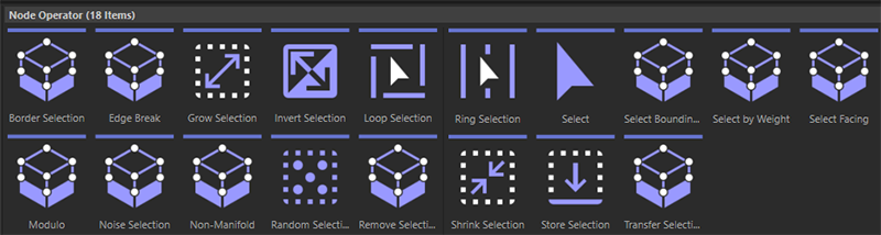 The purple-colored Nodes in this group can also be dragged directly into the Object Manager, where they are designed for subordination. In this case, a parent object can be accessed directly within the circuit of these Nodes, e.g., to deform it, create a selection on it or execute modeling functions. As with the aforementioned Nodes, however, these functions must first be created in the circuit of these Nodes themselves. When dragged from the Asset Browser into the Object Manager, these Nodes initially offer no function.