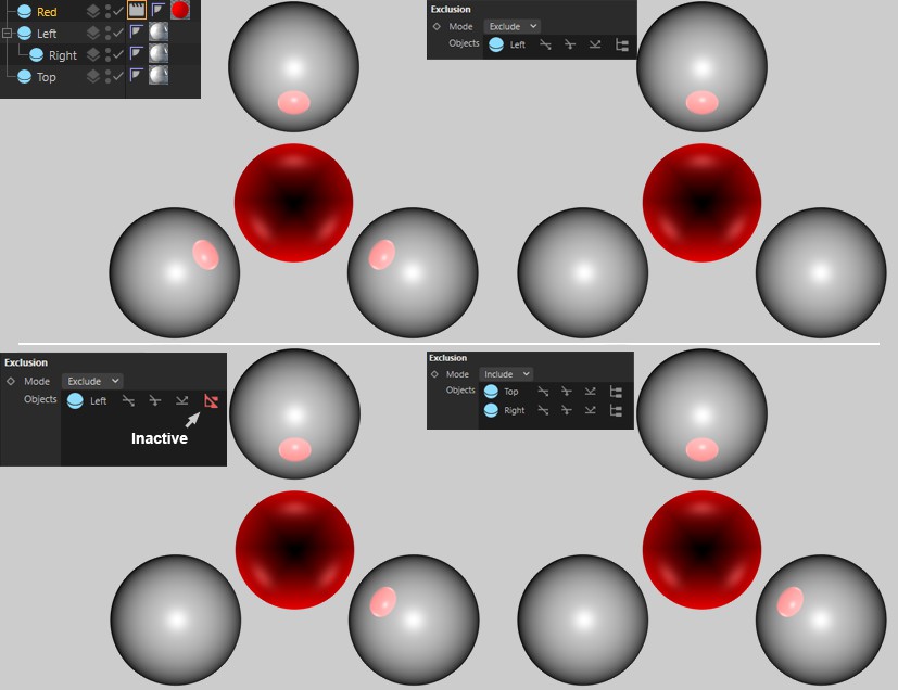 In the image below, a red sphere with a Compositing tag is mirrored by other spheres. You can include or exclude any of the gray spheres in the Include / exclude list to define which spheres will reflect the red sphere.