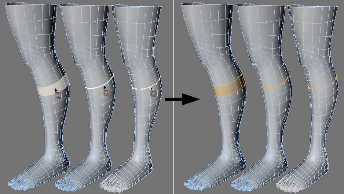 You can select loops in all three modes (point, edge and polygon) using this selection tool. What are loops? Loops are elements (points, edges or polygons) that are connected in the shape of a loop. Loops are commonly used when modeling 3D characters because they help to ensure perfect deformation when a character is animated or posed using joints. These loops frequently need to be edited. Loop Selection gives you a quick way to select the loops.