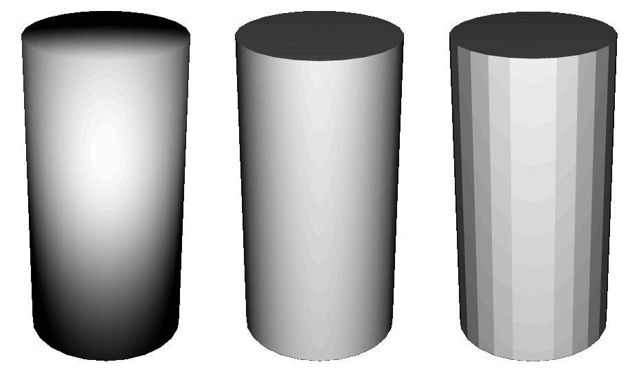 The effect of this function is shown in the example below. A simple cylinder was used as a test object. The image at the left Phong Angle was applied without Angle Limit, in the center Angle Limit was set to 89.5° and the cylinder at the right has no Phong Angle applied.