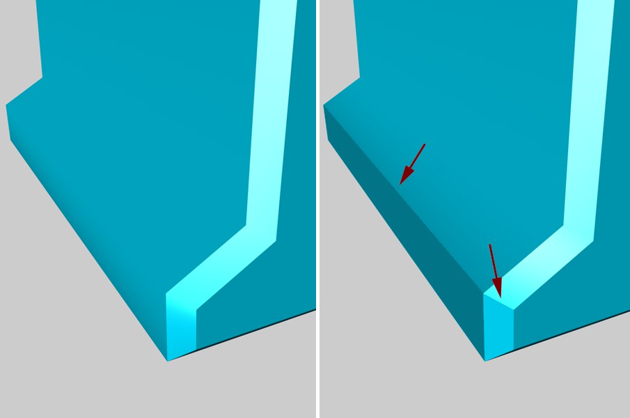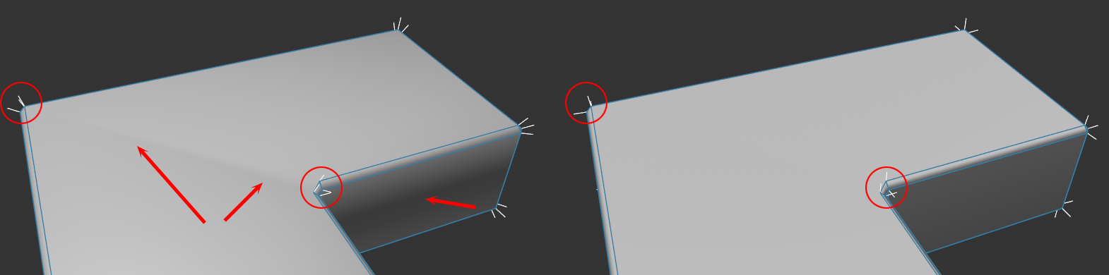 Here, area size ratios are taken into consideration, which means that the large surface on top has a much larger effect at a beveled edge than the narrow beveled surfaces. This, for example, reduces the effect of long triangles that would otherwise produce shading errors. This method is particularly well-suited for beveling. It keeps you from having to subdivide the bevel for better edge shading, for example.