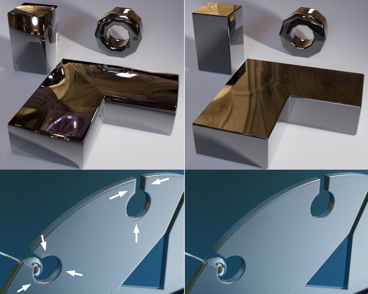 Even reflections use Vertex Normals. On the left, Style is set to Uniform (reflects older Cinema 4D versions), which results in problematic reflections; on the right each with an area weighting. Note the marked problematic regions at the bottom half of the image, which result from Boolean operations.