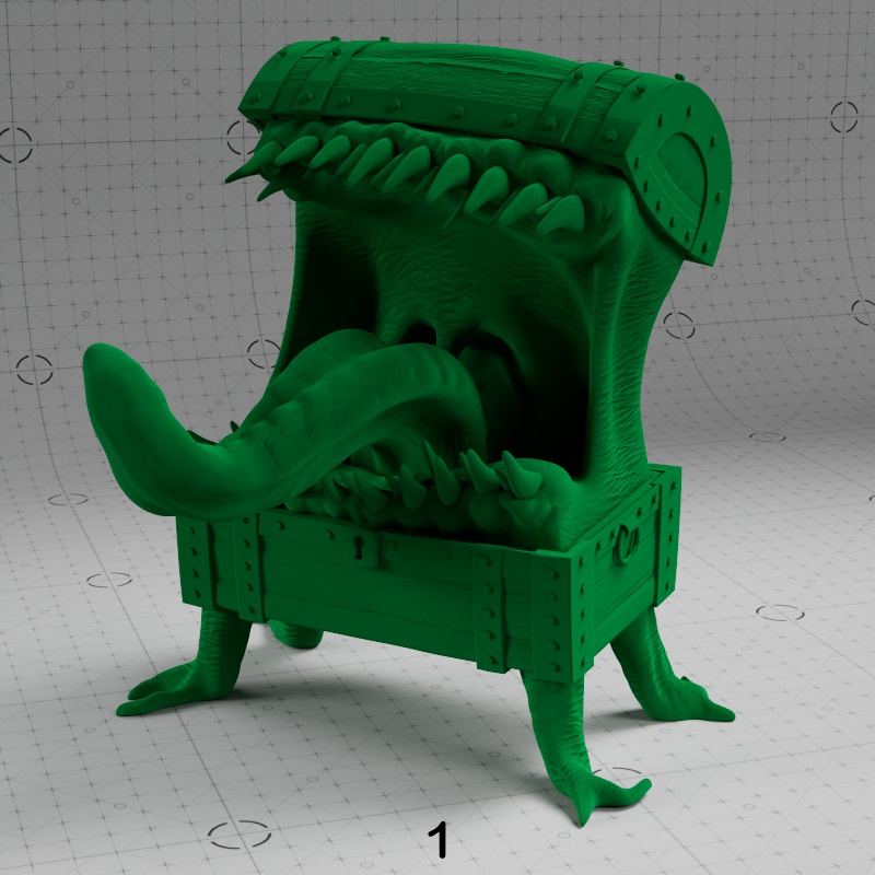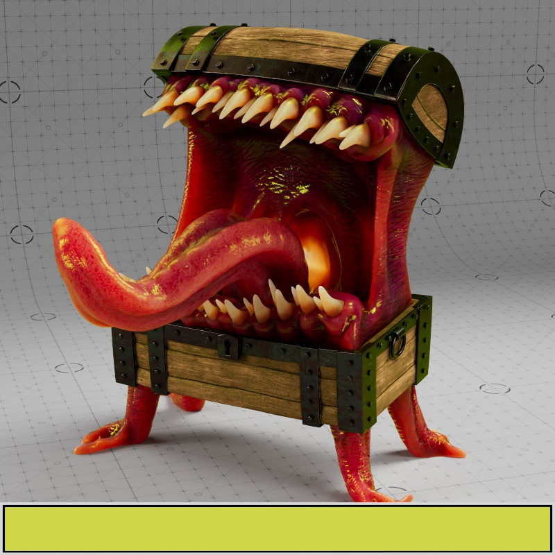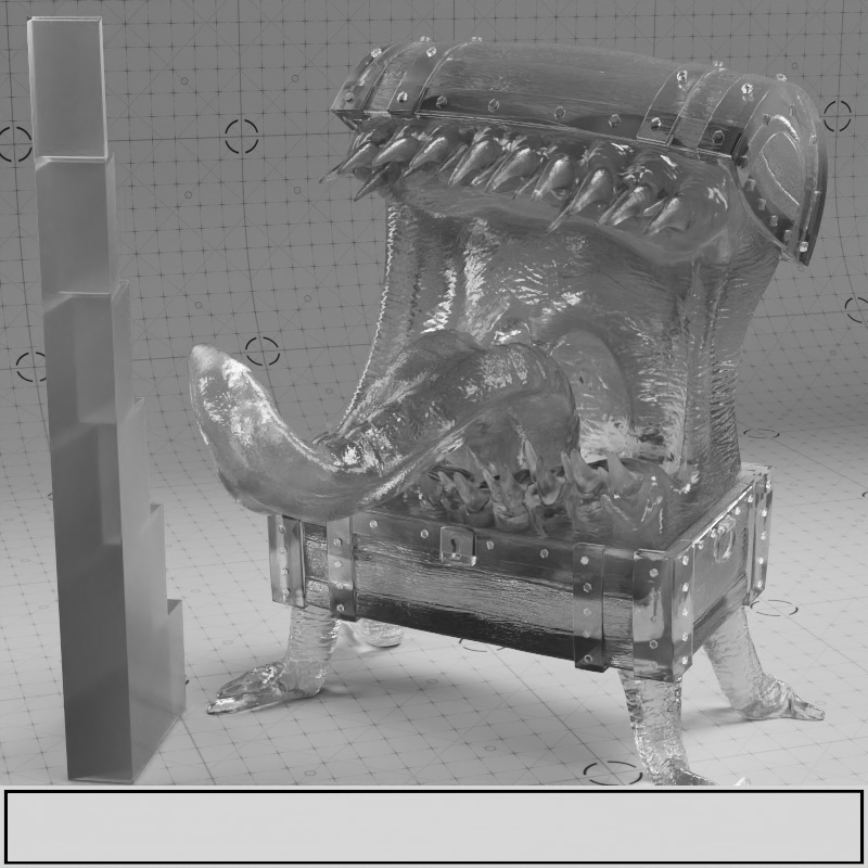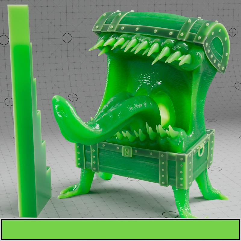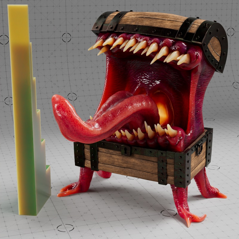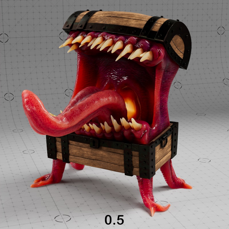 In the examples using the full texture setup, only the Mimic's body, teeth, and tongue have subsurface scattering. Additionally, where metalness is used, no subsurface scattering can appear.