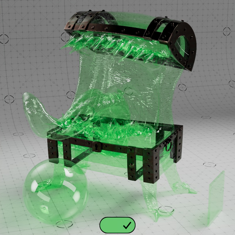 Note how the objects exhibit a stronger refraction color in thick areas when Depth is set to 3, compared to the constant coloration exhibited when Depth is 0. For more detail on this behavior, please see the Transmission Depth parameter description.