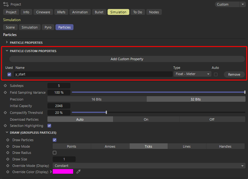 First, a new user property with the name "y_Start" is created here in the simulation settings for the particles, which uses the floating point meter data type. This value should equal the Y-position of each newly born particle at a Base emitter.