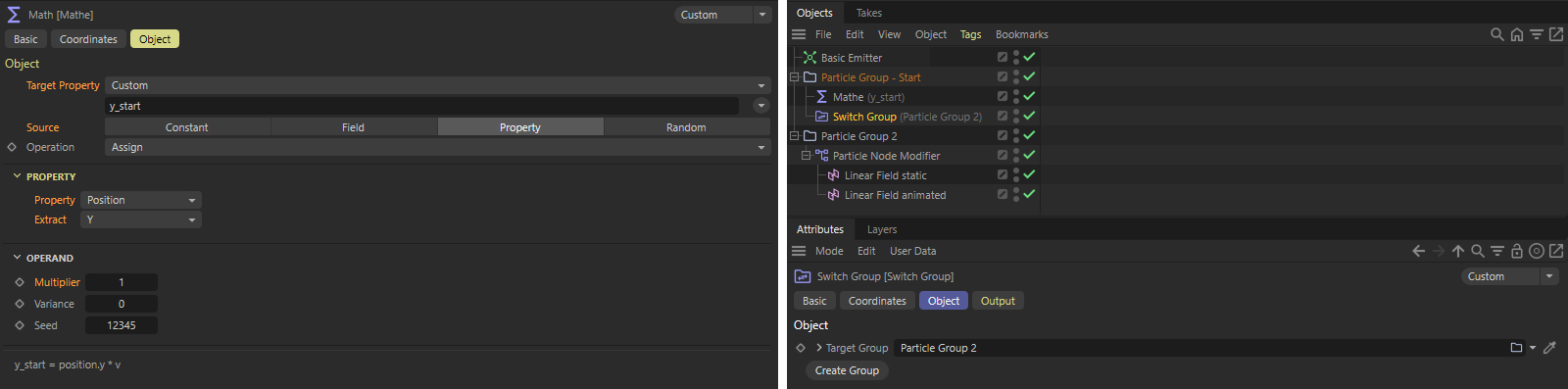 A Math modifier reads the Y-position of the particle and transfers it to the previously defined user property of the particle. Since a group change of the particles takes place immediately afterwards, the custom property only receives its Y start position once, directly after the creation of a particle at the Base emitter. These can then be accessed at any time within the subsequent Particle Node modifier in order to restore the original Y-position of each particle.