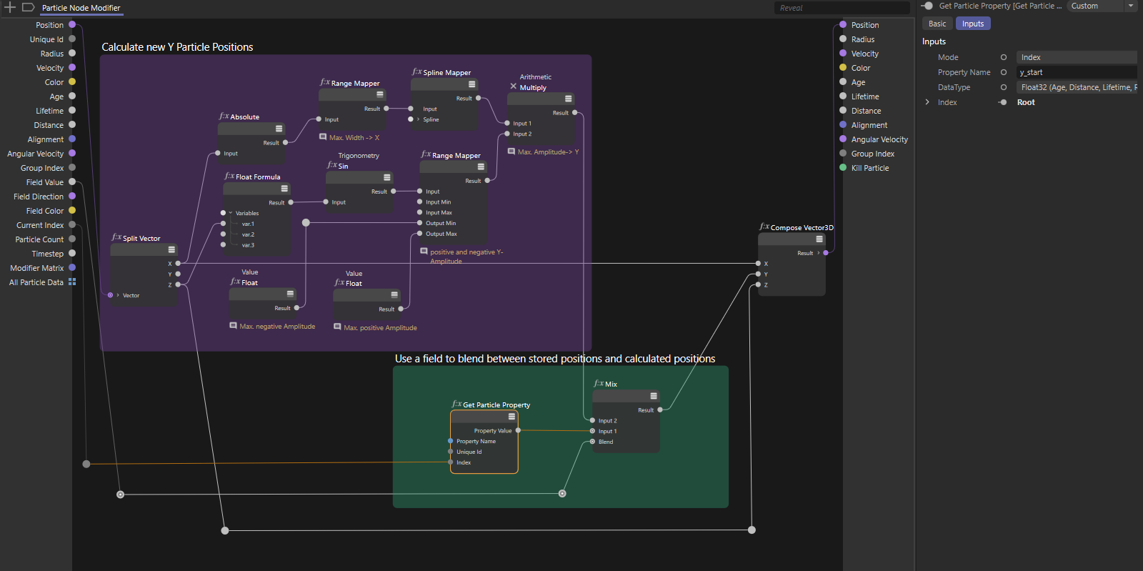 The part of the circuit highlighted in purple calculates a sinusoidal oscillation of the particle Y positions. However, this new position is mixed with the field strength to the stored Y-position at a Mix Node in the part of the circuit highlighted in green. This means that the particles that are outside the fields always return to their original Y-position.