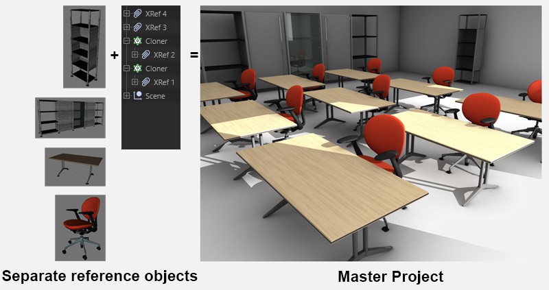 Let's say you are working with a very large Project that contains several complex objects. One person is responsible for placing or animating the objects and others are creating the final models. Objects that are part of individual Reference Projects can be added to the master file via XRef which lets the Master Project be updated quickly and easily without having to go through a laborious Merge process for each Project.