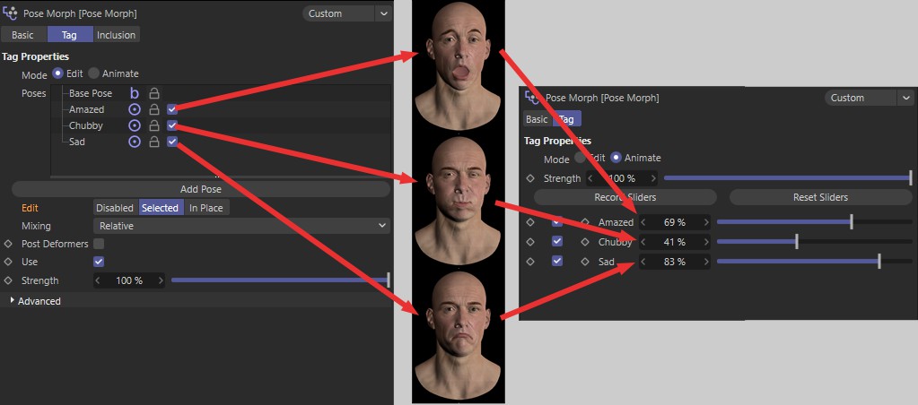 And yes, even morphs of the same type can belong to separate Pose Morph tags. This is a great way to organize, says, regular facial morphs in one tag, and correctional morphs in another (both Points based morphs).