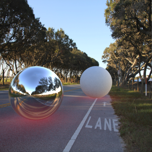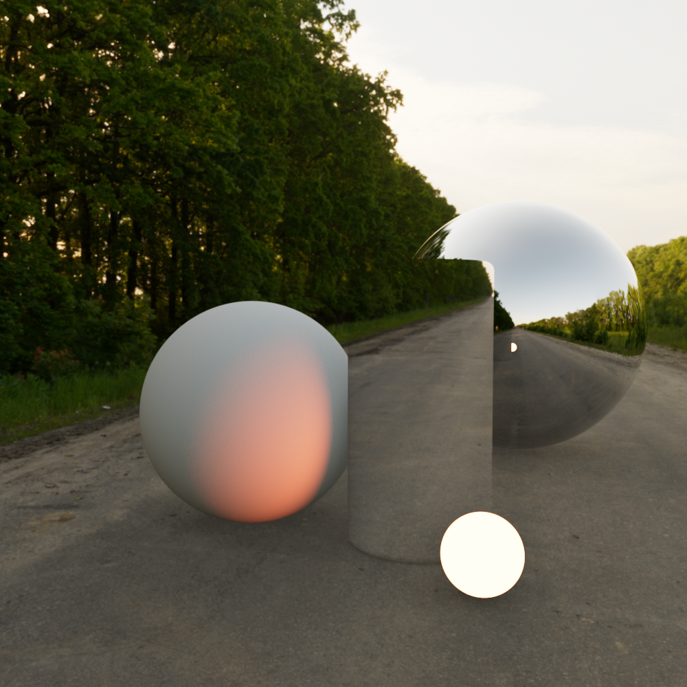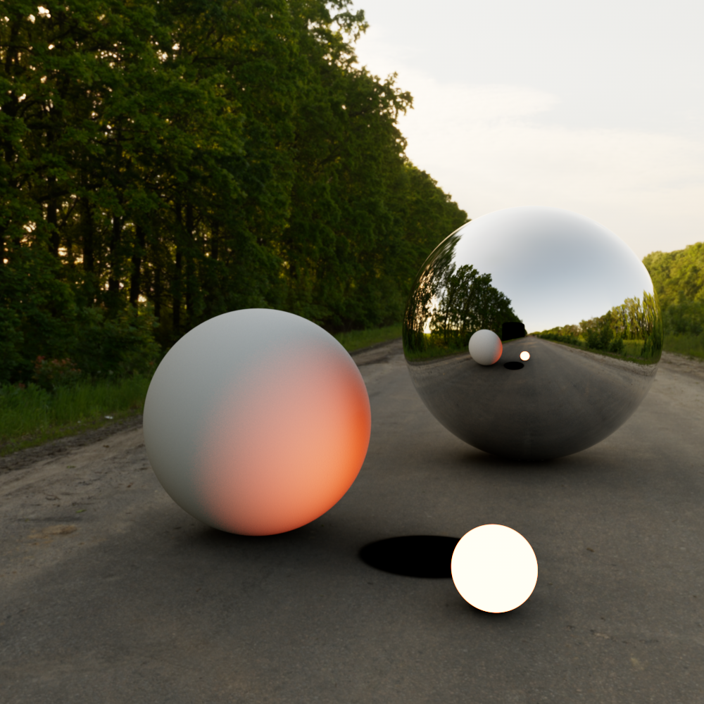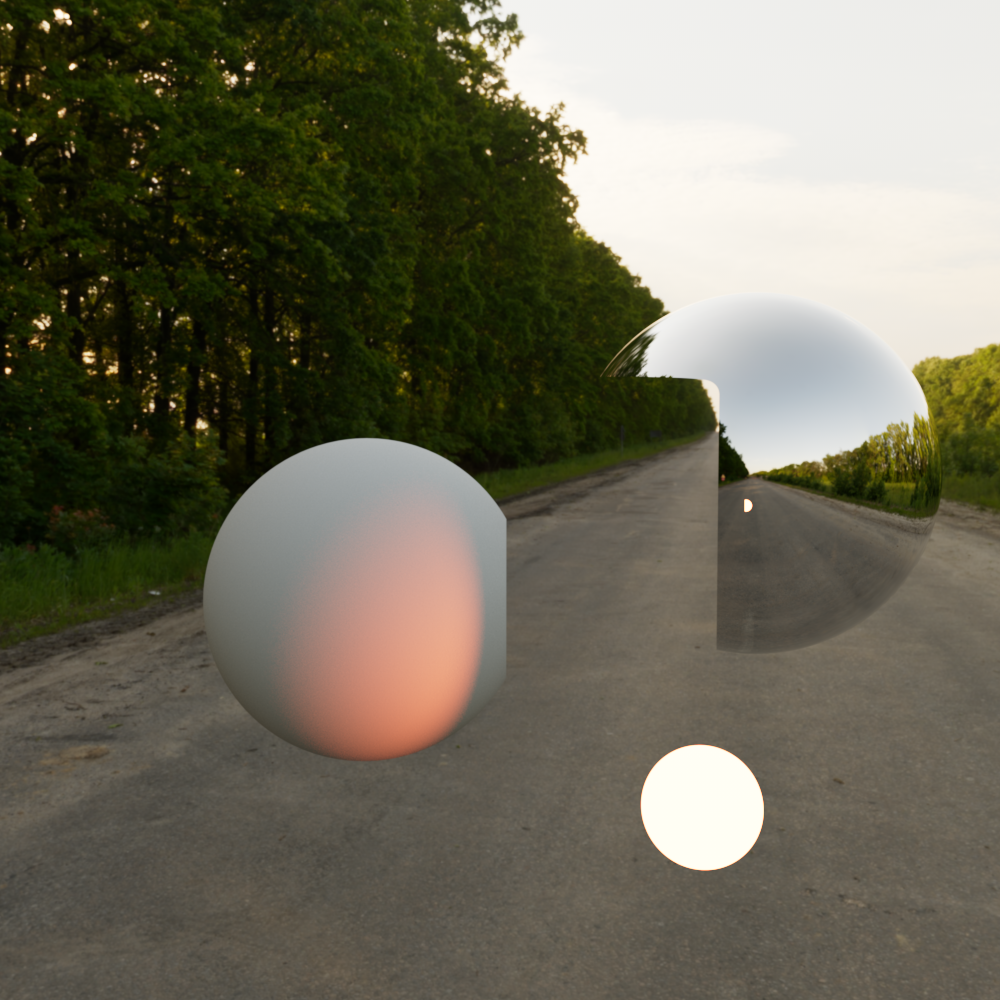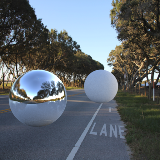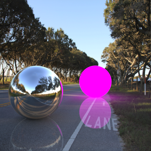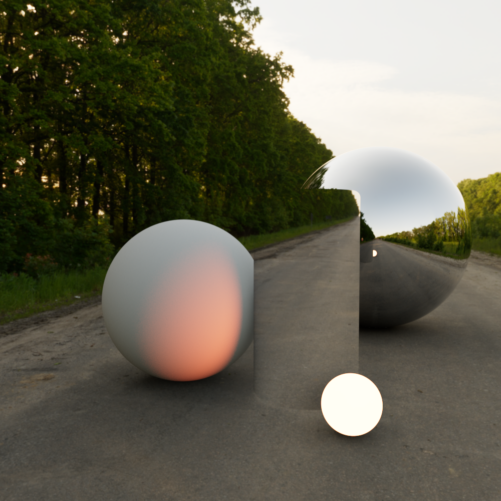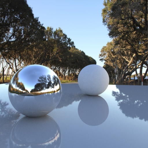 Below is an example of a simple scene containing two spheres, a reflective plane and a dome light with back-plate enabled for the background image.