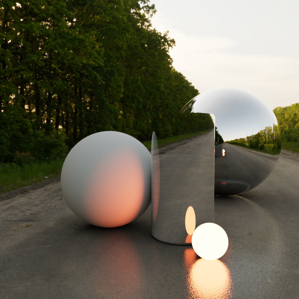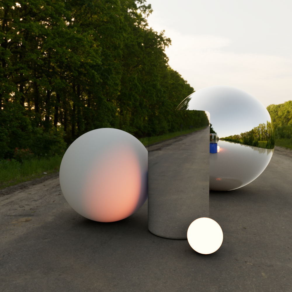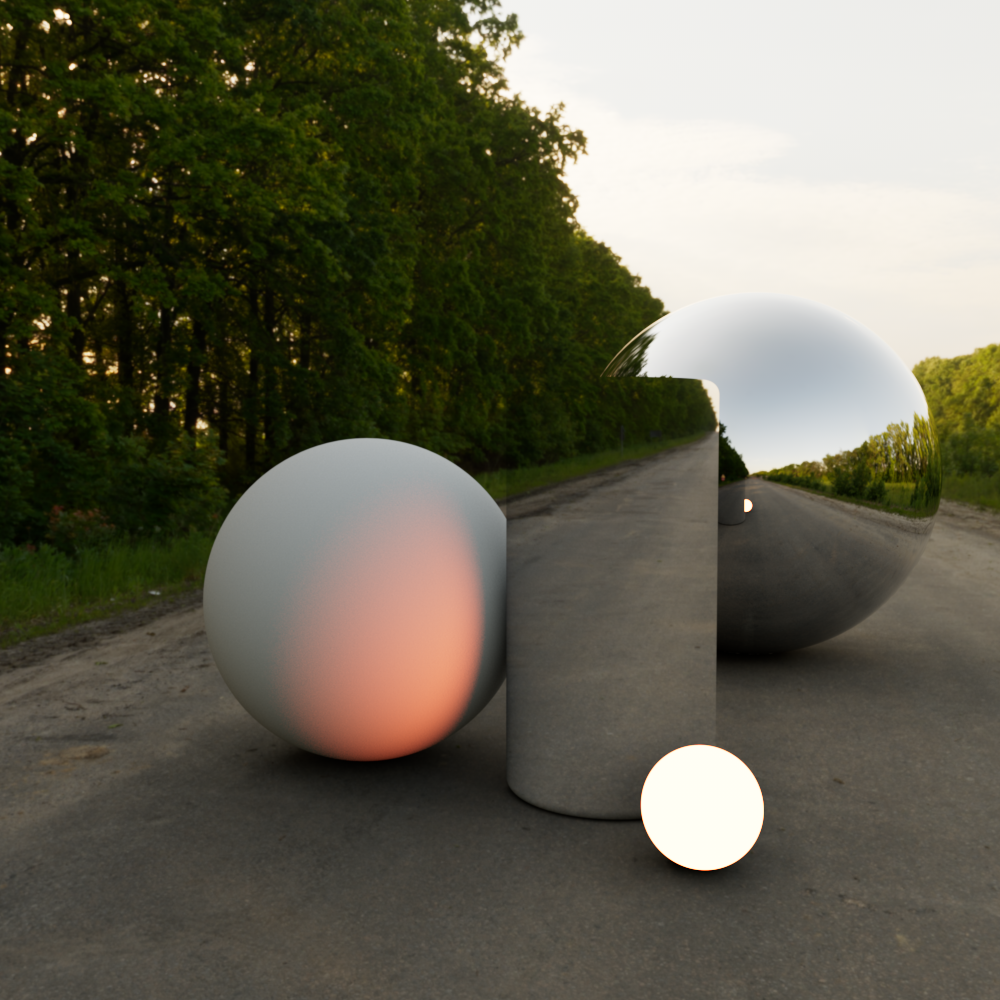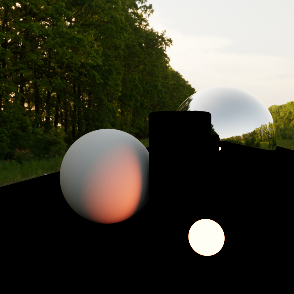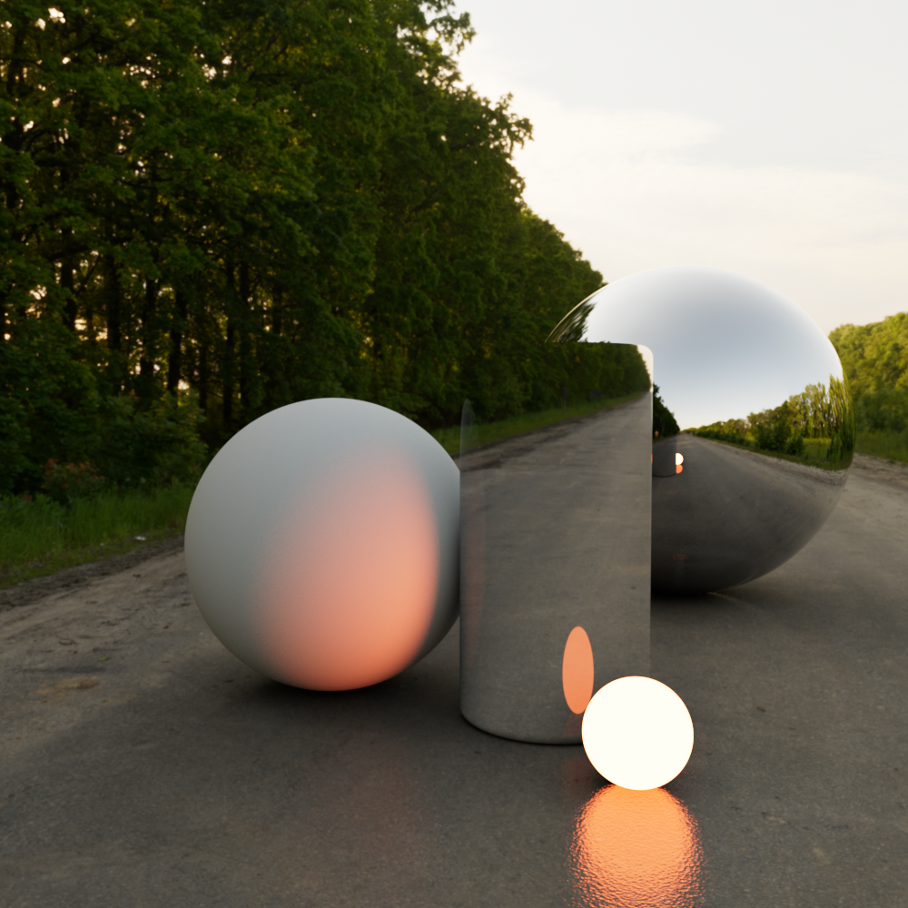 Below is an example of a simple scene containing two spheres, a reflective plane and a dome light with back-plate enabled for the background image.