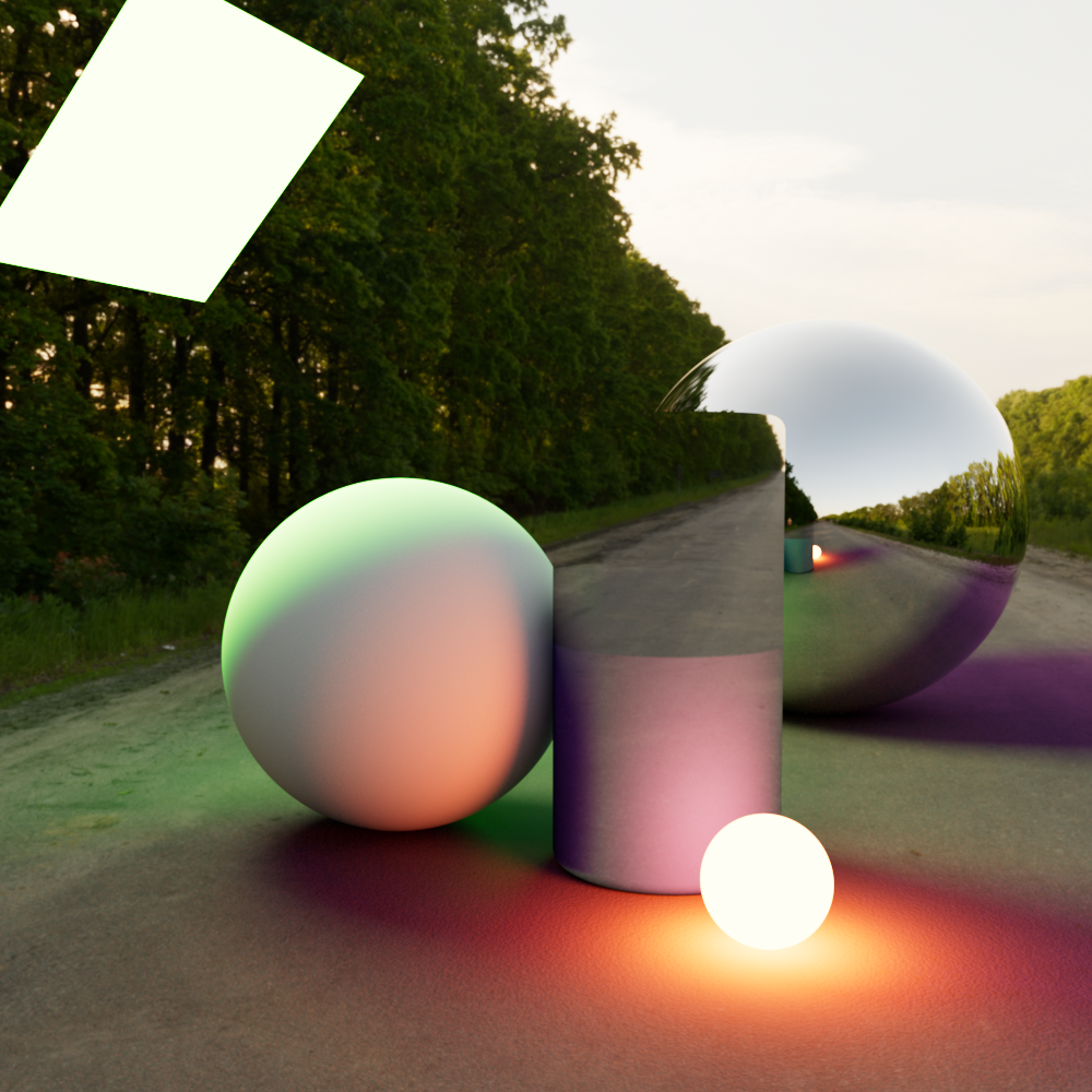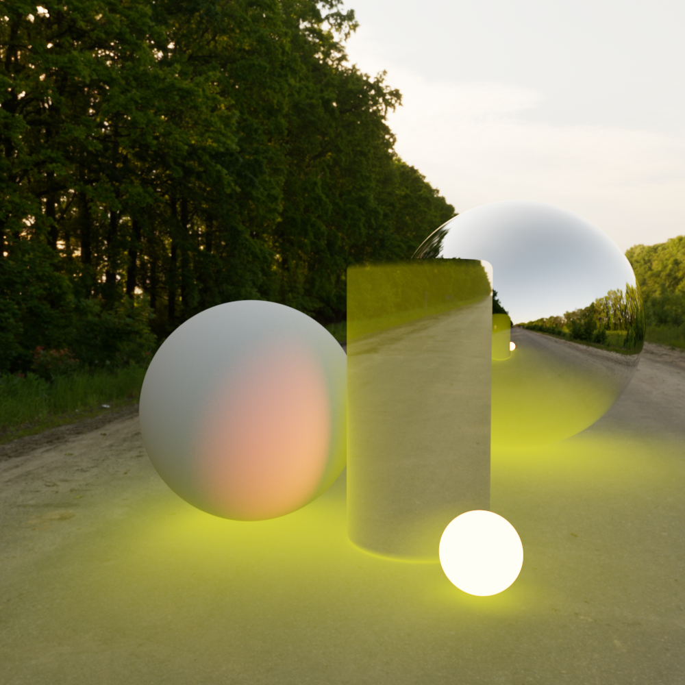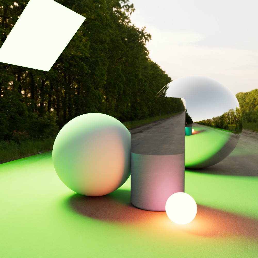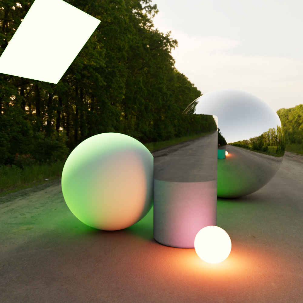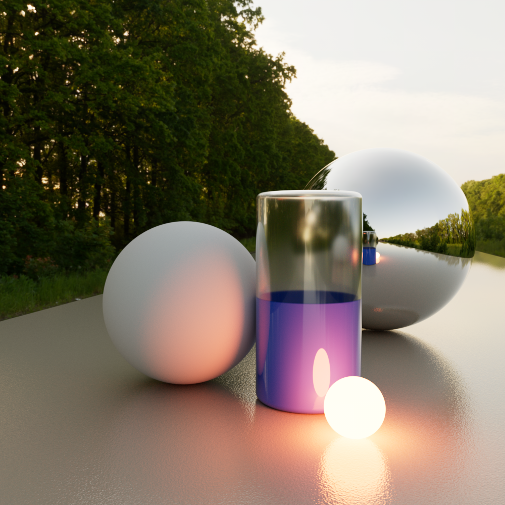 Below is an example of a simple scene containing two spheres, a reflective plane and a dome light with back-plate enabled for the background image.