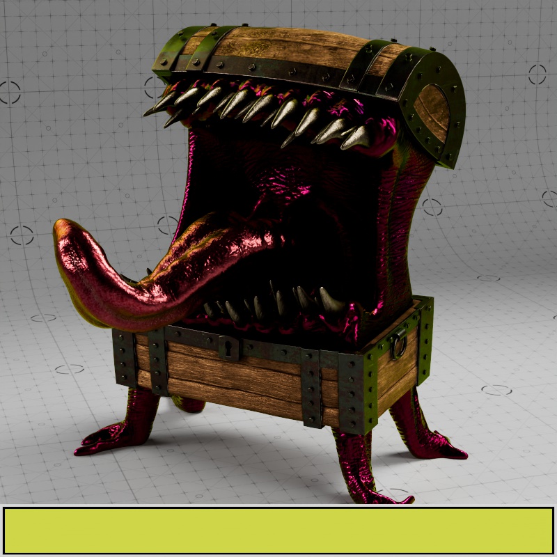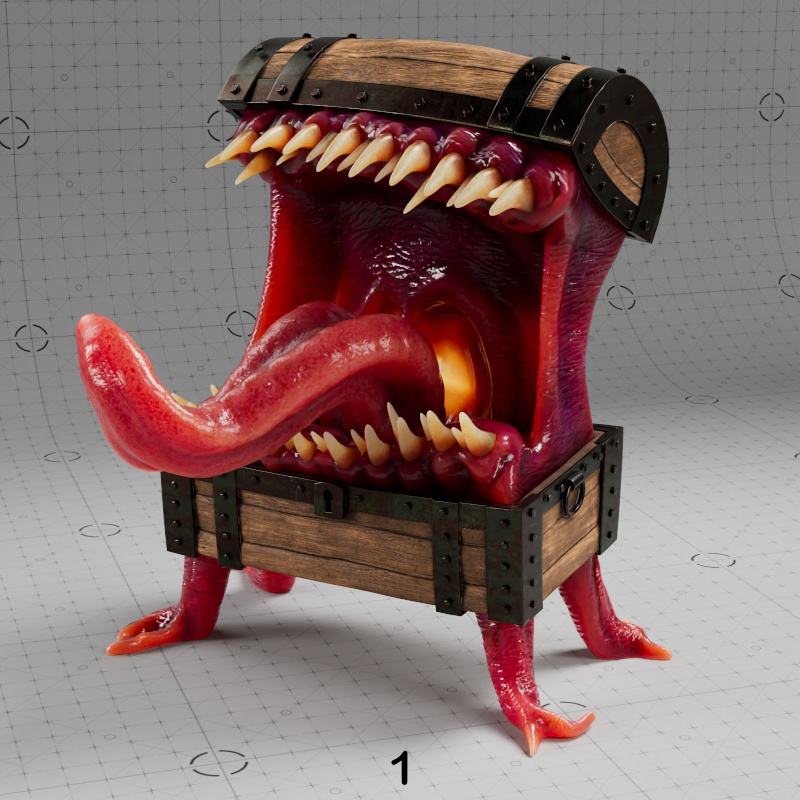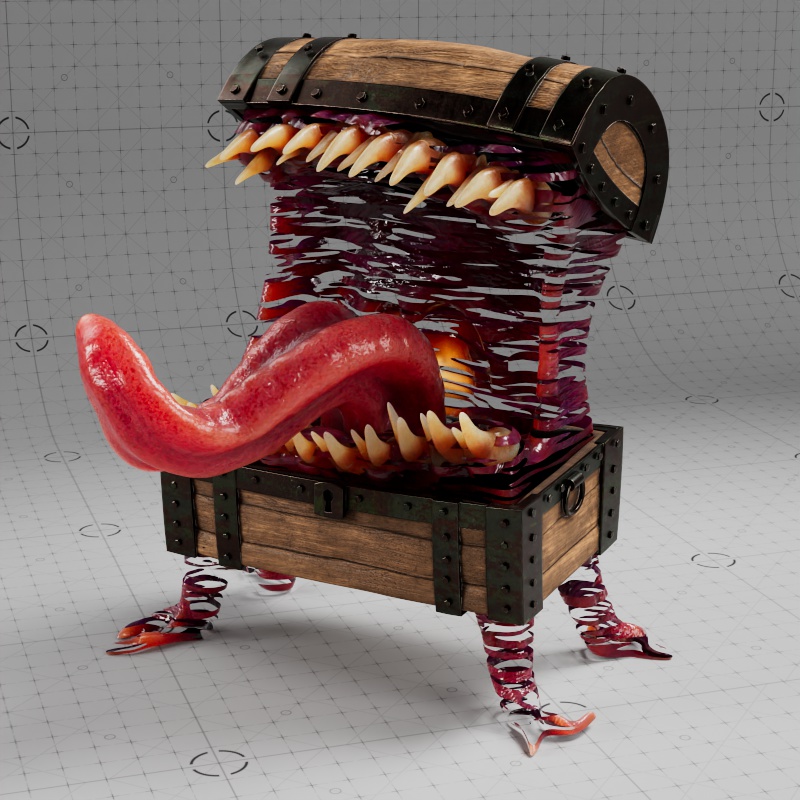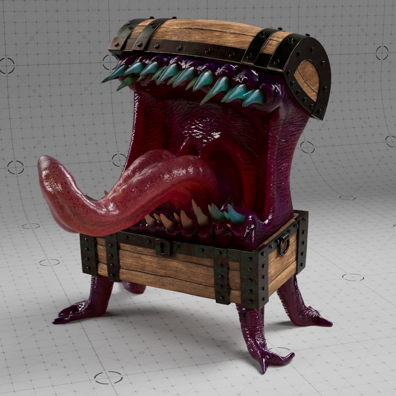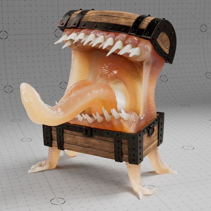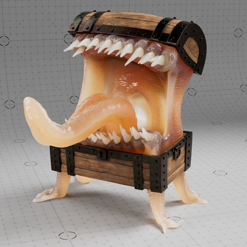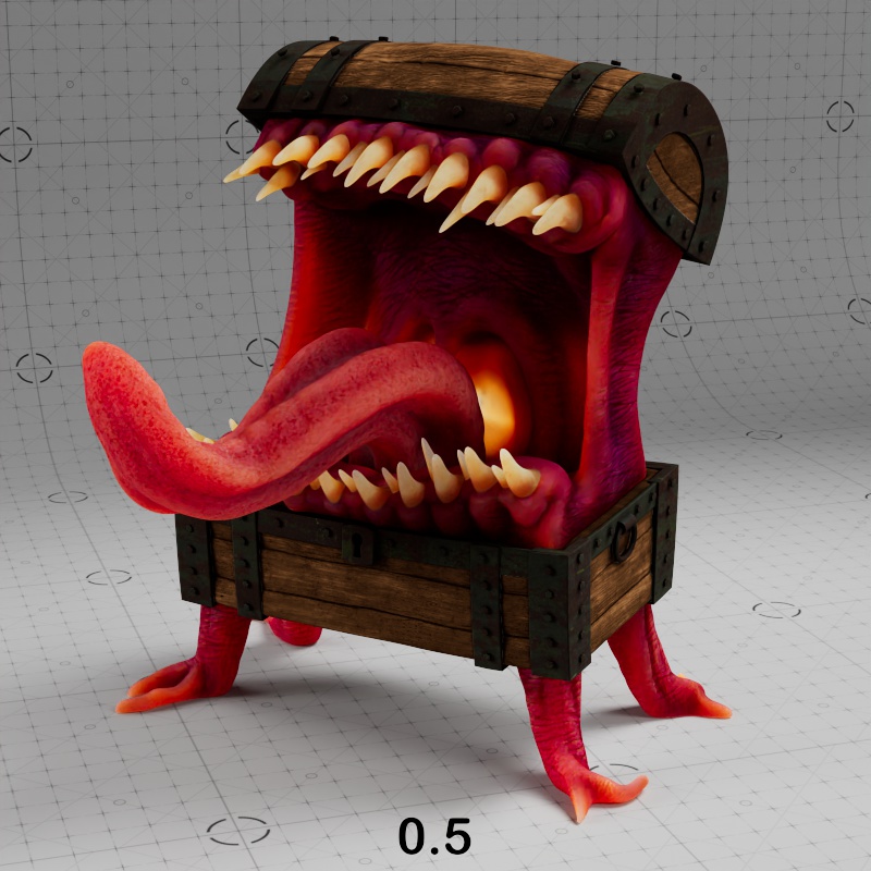 In the examples using the full texture setup, only the Mimic's body, teeth, and tongue have subsurface scattering. Additionally, where metalness is used, no subsurface scattering can appear.
