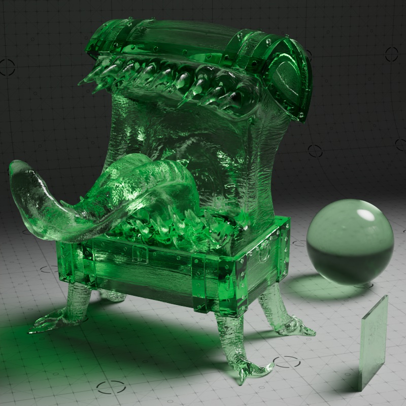 In the examples below, note how the final result is highly dependent on the location of the light source relative to the transmissive object. All examples showcase a transmission anisotropy from -0.8 to +0.8, positive values frequently lead to a more glassy appearance while negative values lead to a more frosted look.