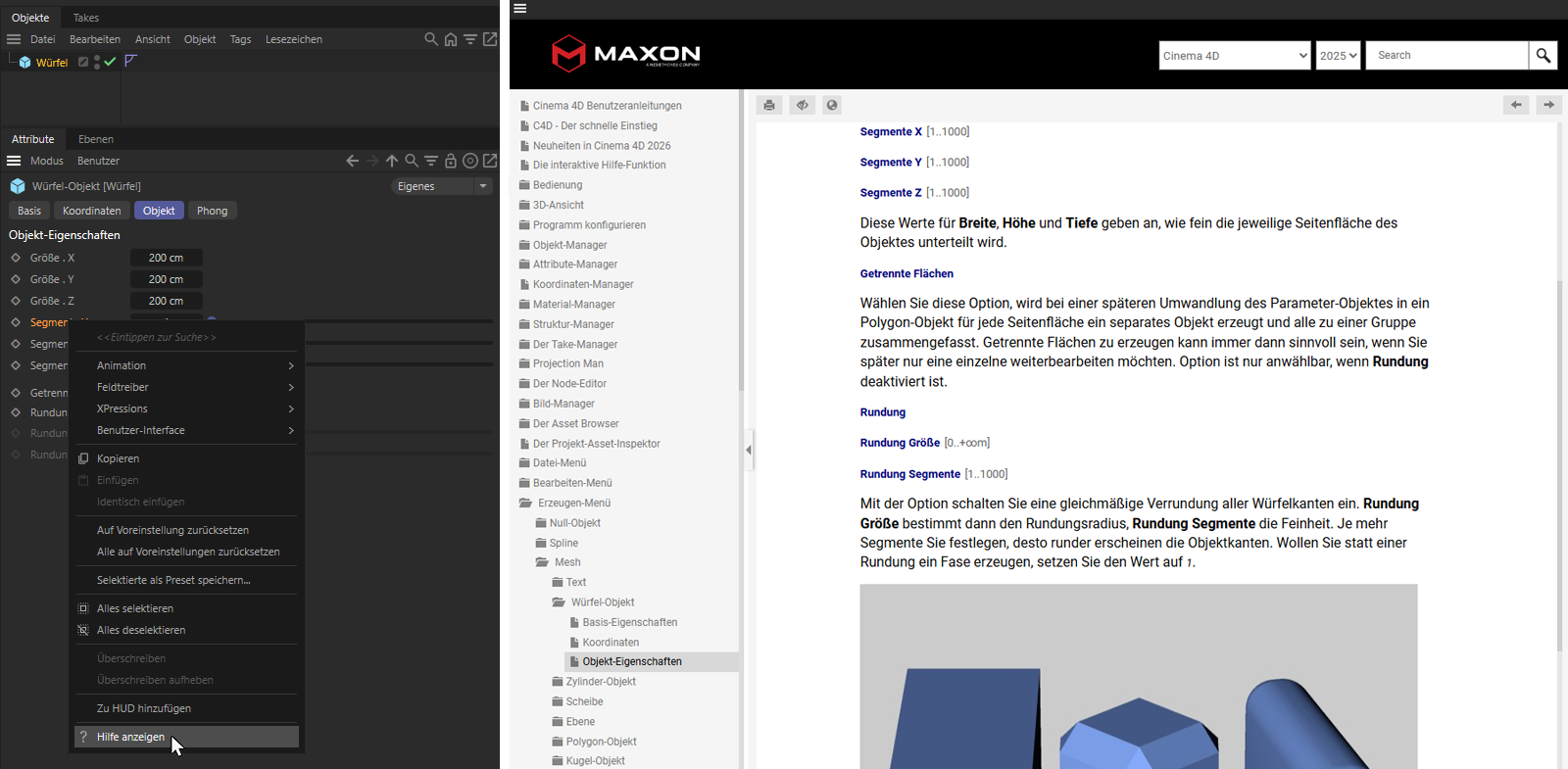 Die interaktive Hilfe ist tief im Cinema 4D-Interface integriert. In vielen Fällen lässt sich auf einen Parameter, wie in obigem Beispiel die Segmente X-Einstellung eines Würfels, Rechts-Klicken, um aus dem Kontextmenü die Hilfe aufzurufen, die dann direkt die Erläuterungen zu diesem Parameter anzeigt (rechts im Bild).