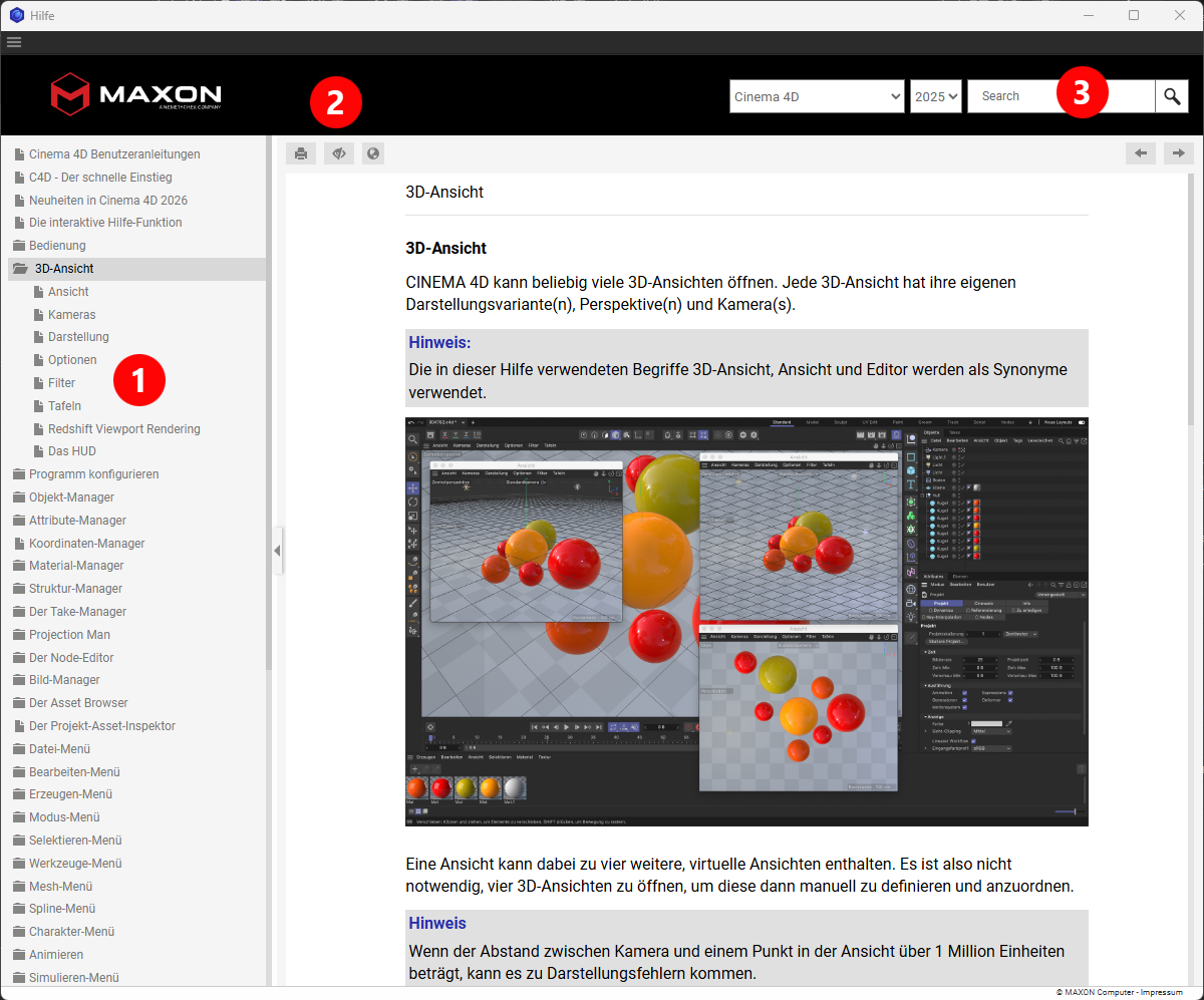 Die Hilfe kann jederzeit über das Cinema 4D Menü geöffnet werden. Aber auch ohne geöffnetes Cinema 4D kann die Hilfe für alle Maxon One Produkte über die Webseite http://help.maxon.net erreicht werden.