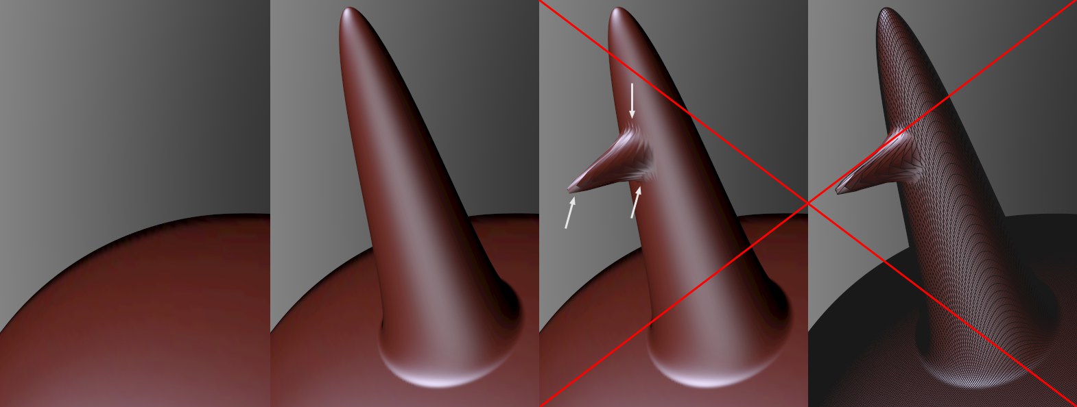 Hier wurde zunächst problemlos ein Stachel (übrigens mit dem Fassen-Pinsel) aus der Oberfläche gezogen. Die Problematik zeigt sich dann im 2. Vorgang: wenn Sie aus diesem Stachel wiederum einen kleineren Stachel ziehen wollen, stoßen sie an die Grenzen des Unterteilungsverfahrens. Das Ursprungsobjekt sollte in seiner Form schon grob dem finalen Objekt entsprechen (da wie oben gezeigt, ein "Um-die-Ecke-Formen" nur schwer möglich ist). - Sollten Sie sich - wie beim vorherigen Punkt beschrieben - durch starkes Formen in die “Ecke” manövriert haben, so kann das