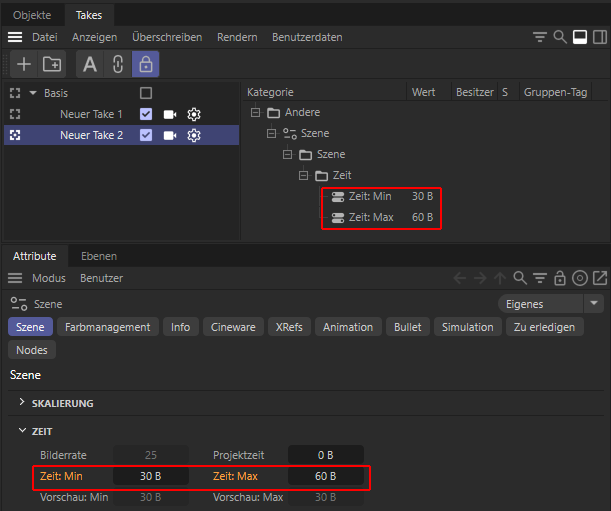 Einige Szeneneinstellungen wurden in das Take-System integriert (z.B. Attribute-Manager/Szene: Tab “Szene). Hier können z.B. Zeit: Min und Zeit: Max pro Take eingestellt werden: