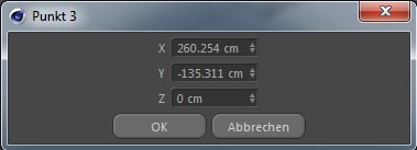 Generell können Sie Punkte (die von Splines und Geometriepunkten), sofern eines der Werkzeuge Verschieben, Skalieren und Drehen aktiviert ist, auch nummerisch einstellen, indem Sie auf einen der Punkte doppelklicken. Es öffnet sich dann ein Fenster, in dem Sie die Position (im Falle eines Bézier-Splines auch die Tangenten) eingeben können.
