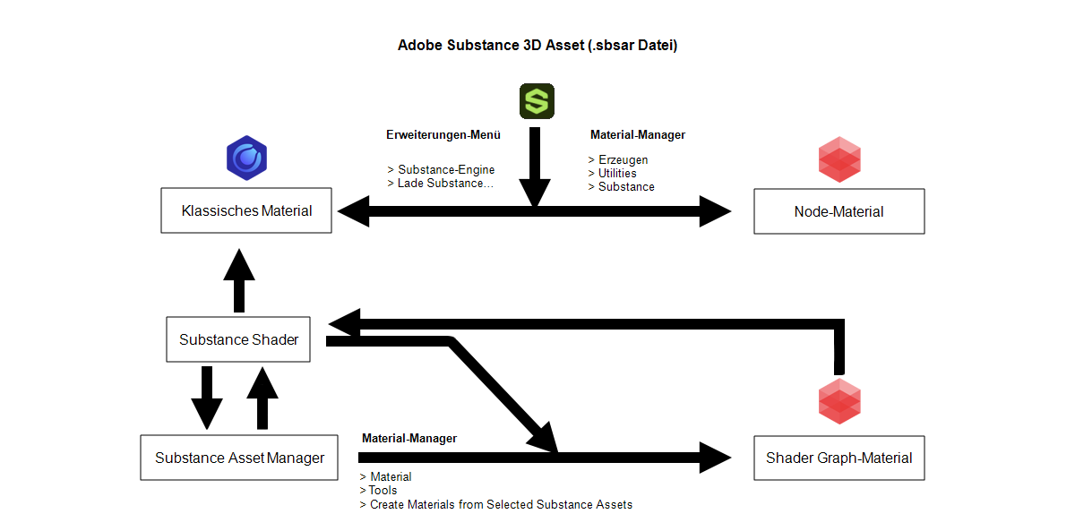 Das folgende Diagramm zeigt die verschiedenen Optionen, die beim Zusammenspiel zwischen Adobe Substance 3D Assets und Cinema 4D möglich sind. Diese Vielzahl an Optionen ergibt sich aus der Unterstützung der verschiedenen Renderer (klassische Cinema 3D oder Redshift) und den verschiedenen Node-Systemen (Node-Material oder Shader Graph-Material).