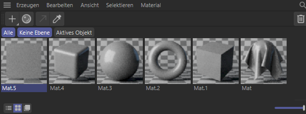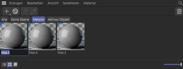 Die Anzeigemodi für Materialien können durch die drei Icons links unten im Material-Manager umgeschaltet werden. Rechts daneben ist auch der Regler zu finden, mit dem die Größe der Material-Vorschaubilder verändert werden kann.