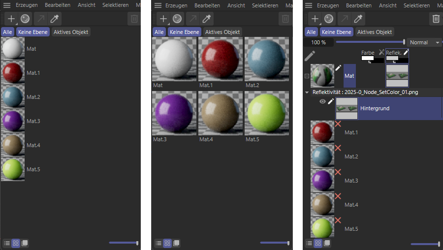 Die drei Haupt-Anzeigemodi für Materialien sind in der folgenden Abbildung zu sehen. Unabhängig vom gewählten Modus kann die Größe der Vorschaubilder mit dem Regler beeinflusst werden, der rechts unten im Material-Manager zu finden ist.