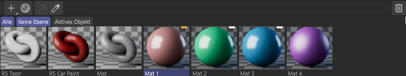 Zu guter Letzt gibt es noch den Reiter Aktives Objekt. Dort können alle Materialien der im Objekt-Manager selektierten Objekte angezeigt werden. Beachten Sie, dass dafür gleichzeitig der Reiter Alle selektiert sein sollte. Aktives Objekt wirkt dann wie ein Filter, der immer aus den über die übrigen Reiter ausgewählten Materialien diejenigen herausfiltert, die am selektierten Objekt zugewiesen wurden. Ansonsten wird Aktives Objekt mit anderen selektierten/unselektierten Reitern als logisches UND kombiniert und es wird evtl. gar nichts angezeigt.