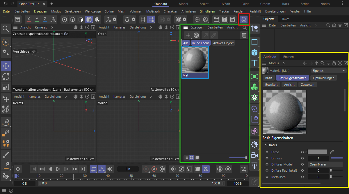 Das Icon zum Öffnen oder Schließen des Material-Managers ist hier rot umrandet zu sehen. Im Material-Manager (grüne Umrandung) erscheinen die erzeugten Materialien als Vorschaubilder (blaue Umrandung). Ein selektiertes Material stellt seine Standardeinstellungen im Attribute-Manager zur Verfügung (siehe gelbe Umrandung).