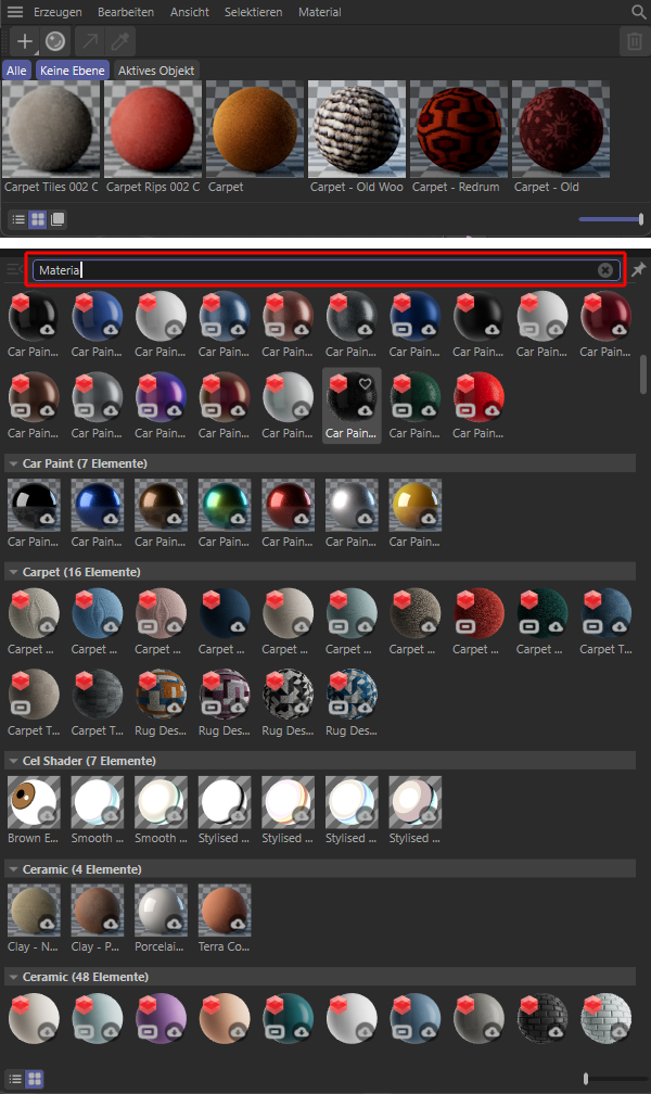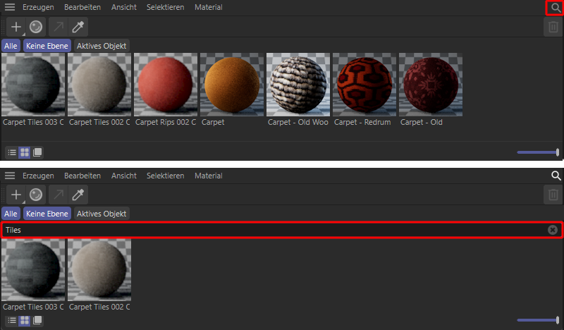- Das Lupe-Symbol blendet eine Suchleiste ein- oder aus, die so auch in anderen Managern, wie z. B. dem Objekt-Manager angeboten wird, um die angezeigten Elemente filtern zu lassen. Es werden dann nur noch die Materialien angezeigt, deren Namen Teile des in der Suchmaske eingetragenen Begriffs enthalten.