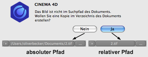 Wenn Sie übrigens Materialien (mit verknüpften relativen Texturpfaden) in ein anderes Projekt kopieren und diese von dort aus nicht gefunden werden, erfolgt eine Abfrage, ob ein absoluter Texturpfad (zum Originalpfad) gesetzt werden soll. Wenn Sie dann verneinen, müssen die Texturen manuell zu den CINEMA 4D bekannten (relativen) Pfaden kopiert werden.