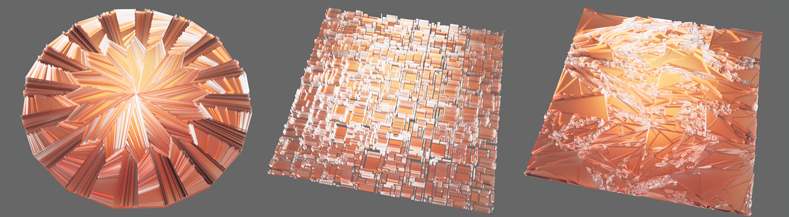 Links wurde eine einfache Scheibe und rechts daneben eine einfache Ebene als Basis verwendet. Der Effekt des Aufteilung-Modifikator zeigt sich in zufälligen oder regelmäßigen neuen Unterteilungen an den Polygonen dieser Objekte, die hier zur Verdeutlichung durch einen zusätzlichen Extrudieren-Modifikator noch verdickt wurden.