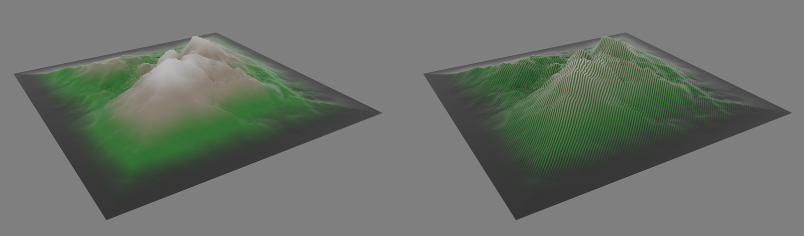 Dank dieses Assets lassen sich sehr einfach Vertexfarben einheitlich, zufällig oder automatisch durch Auswertung der Bounding-Box einer Geometrie zuweisen. Das nachfolgende Beispiel zeigt eine Landschaft, der zunächst über den Node RGB-Farbwerte entlang der X-, Y- und Z-Achsrichtungen zugewiesen wurden. Die grüne Farbkomponente wird dabei standardmäßig entlang der Y-Achse aufgetragen. Über einen Farbverlauf innerhalb eines Redshift-Standardmaterials nutzen wir dann nur diese grüne Farbkomponente und lesen sie zunächst über einen Vertex-Attribute-Node aus. Das Ergebnis wird als Farbverlauf mit den Farben grau, grün und weiß belegt, so wie es im linken Teil der Abbildung zu sehen ist. Da sich der Node auch mehrfach auf die gleiche Vertexfarben-Map wirken lässt, wird ein zweiter Farbe erstellen-Node, diesmal zur Erstellung einheitlicher Farbwerte für die Punkte mit ungerader Indexnummer ergänzt (Selektionszeichenfolge odd) und per Funktion Normal mit den vorhandenen Vertexfarben überlagert. Das Ergebnis ist auf der rechten Seite der folgenden Abbildung zu sehen.