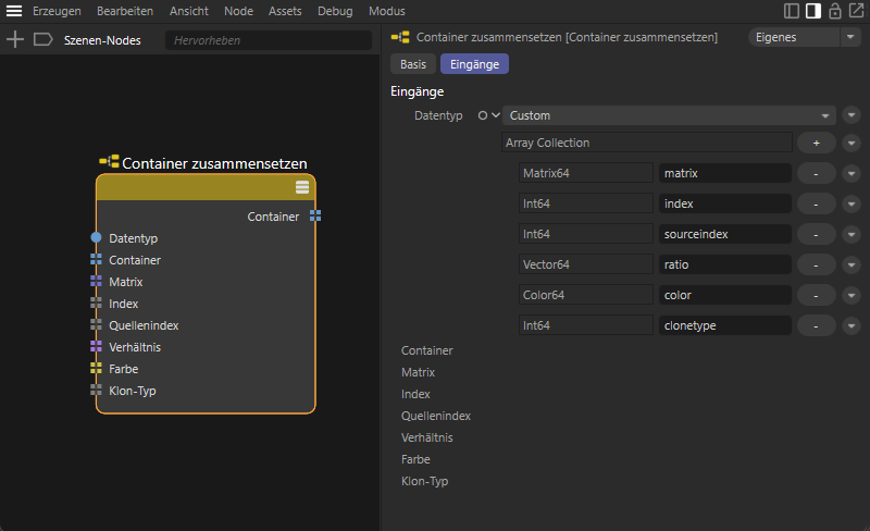 Am Ausgang einer Nodes-Verteilung wird die Verteilung ausgegeben, durch die ein Klon-Objekt die Anzahl, Platzierung und z. B. Färbung der Klone umsetzen kann. Eine Verteilung besteht aus einer Sammlung verschiedener Arrays, die alle so viele Einträge haben müssen, wie Klone erzeugt werden sollen. Für das Zusammenstellen der Verteilung wird in der Regel ein Container zusammensetzen-Node verwendet, an dem die entsprechenden Array-Eingänge mit verschiedenen Datentypen angelegt werden müssen. Die folgende Abbildung zeigt dazu die verschiedenen Arrays und deren Datentypen, die zum Zusammenstellen der Verteilung benötigt werden.