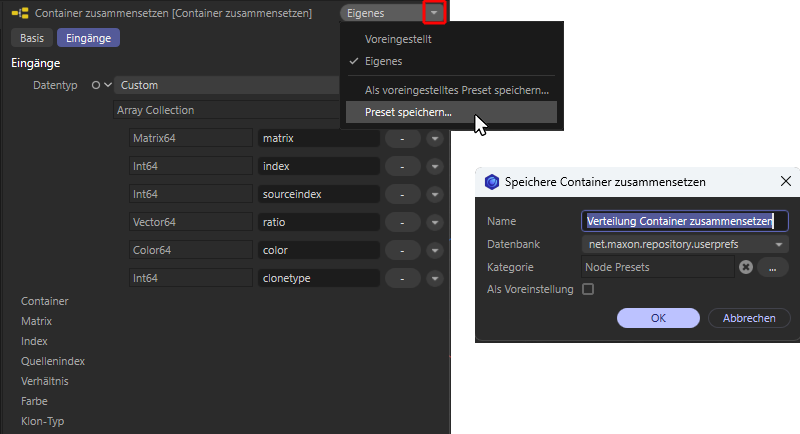 Speichern des modifizierten Container zusammensetzen-Nodes als Voreinstellung zum schnellen Aufrufen bei häufiger Nutzung.