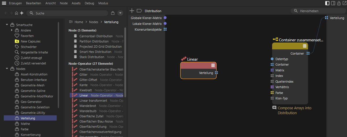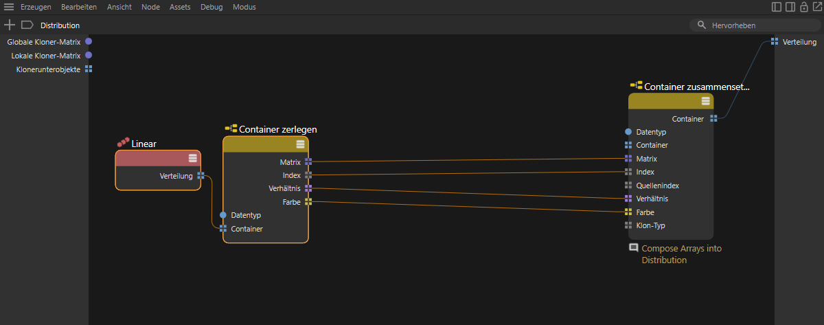 Wie in der folgenden Abbildung festgehalten, lässt sich die vorgegebene Verteilung mit einem Container zerlegen-Node in die einzelnen Arrays zerlegen, die dann an die entsprechenden Eingänge eines Container zusammensetzen-Nodes geleitet werden können, der seine Ausgabe an die Verteilung der Kapsel leitet. Damit ist bereits eine funktionsfähige Verteilung-Kapsel definiert, die jedoch noch über die Einstellungen des Linear-Node im Node-Editor konfiguriert werden muss.