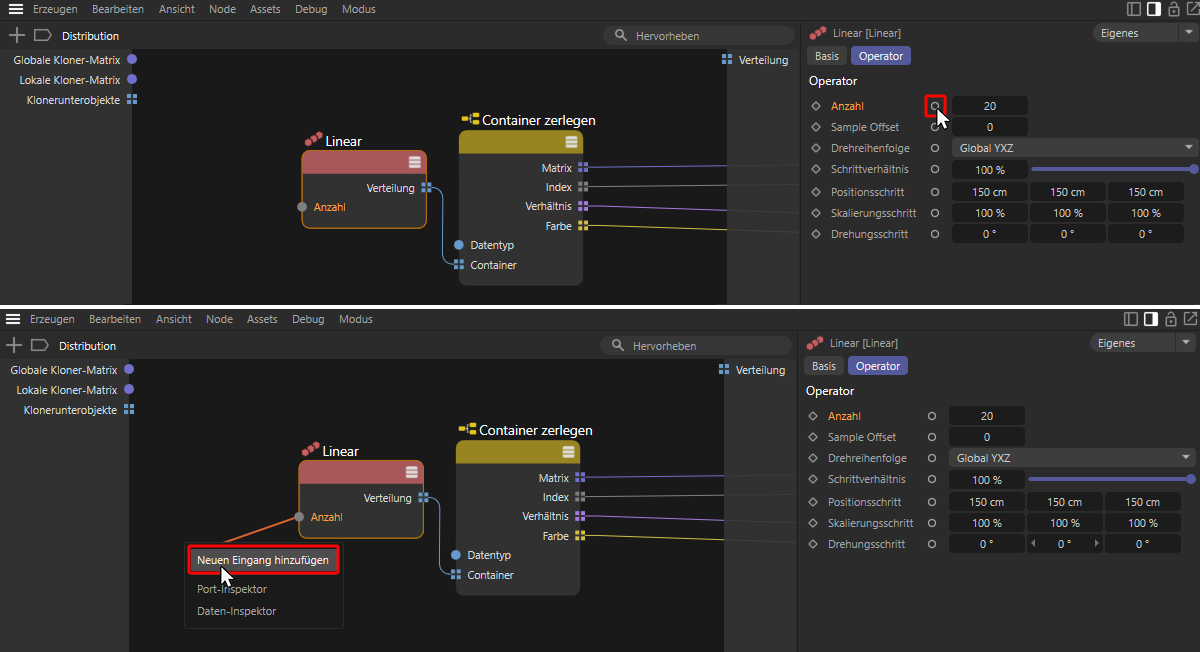 Einer der Kernparameter jeder Verteilung ist sicherlich die Angabe der Anzahl der zu erzeugenden Objektkopien. Wir leiten daher nun den Anzahl-Parameter des Linear-Nodes an die Eingabeseite der Kapsel. Dazu fügen wir zunächst einen Anzahl-Port am Linear-Node hinzu indem wir einen Ctrl-Klick auf da Kreissymbol des Anzahl-Parameters im Attribute-Manager ausführen. Anschließend ziehen wir eine Verbindung von diesem Port zu einem leeren Bereich des Node-Editors und lassen die Verbindung dort durch Lösen der Maustaste fallen. Es öffnet sich ein Kontextmenü, in dem wir über den Eintrag Neuen Eingang hinzufügen einen entsprechenden Werteingang an der Kapsel erzeugen lassen, der automatisch mit dem Anzahl-Eingang des Linear-Nodes verbunden wird (siehe folgende Abbildung).