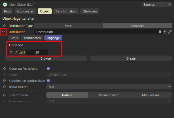 Derart herausgeführte oder manuell an der Eingangsseite der Kapsel erzeugte Eingänge erscheinen automatisch auch in den Eingaben des Klon-Objekts, so wie es die folgende Abbildung zeigt. Dazu muss nur die kleine Pfeil-Schaltfläche vor dem Verteilung-Verlinkungsfeld aufgeklappt werden. In der Eingabe-Rubrik darunter sind dann die Eingangswerte der Verteilung zu finden. Dies ermöglicht die bequeme Bedienung der Nodes-Verteilung, ohne dafür im Node-Editor arbeiten zu müssen.