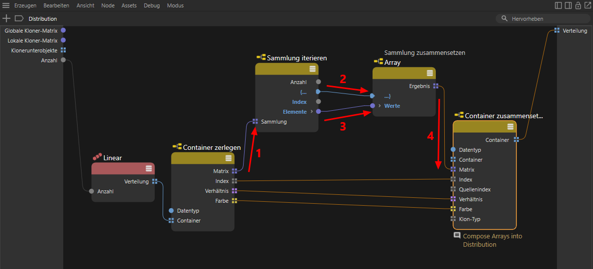 Hier sind die verschiedenen Arrays und deren Datentypen zu erkennen, die an einem Container zusammensetzen-Node vorhanden sein sollten, um alle Eigenschaften einer Verteilung definieren zu können.