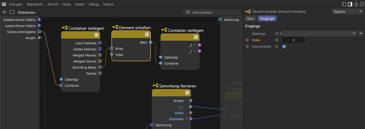 Achten Sie auch auf die richtigen Datentypen der Sammlung zusammensetzen-Nodes. Das Index-Array muss vom Typ Integer sein und das Verhältnis-Array sollte ein Vektor-Array sein. Entsprechend schalten wir hier einen Vektor zusammensetzen-Node vor, so wie es oben in dem gelblich unterlegten Schaltungsteil zu sehen ist.