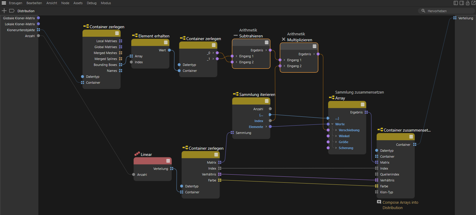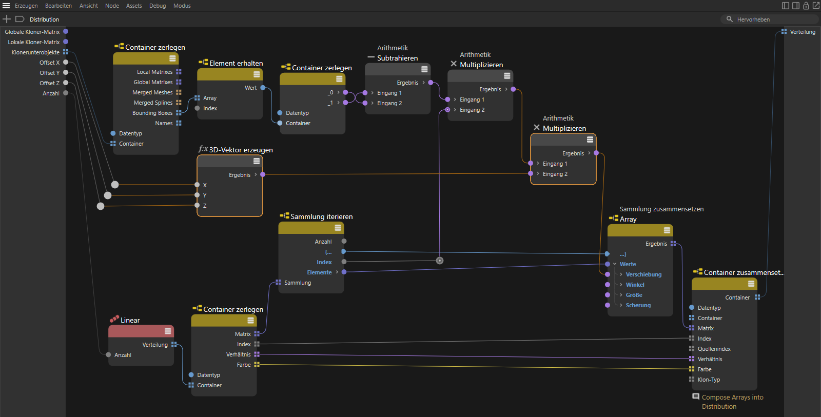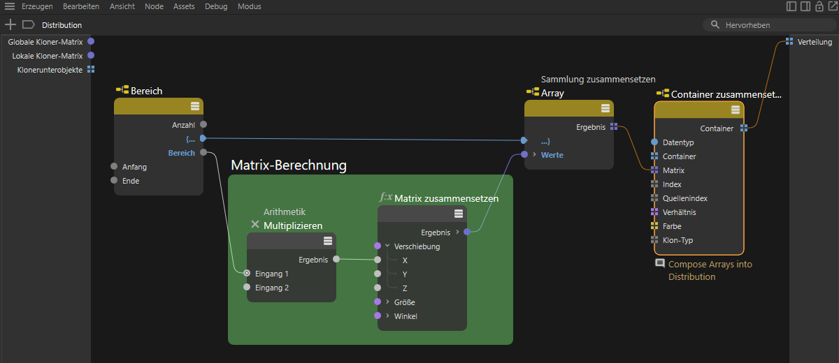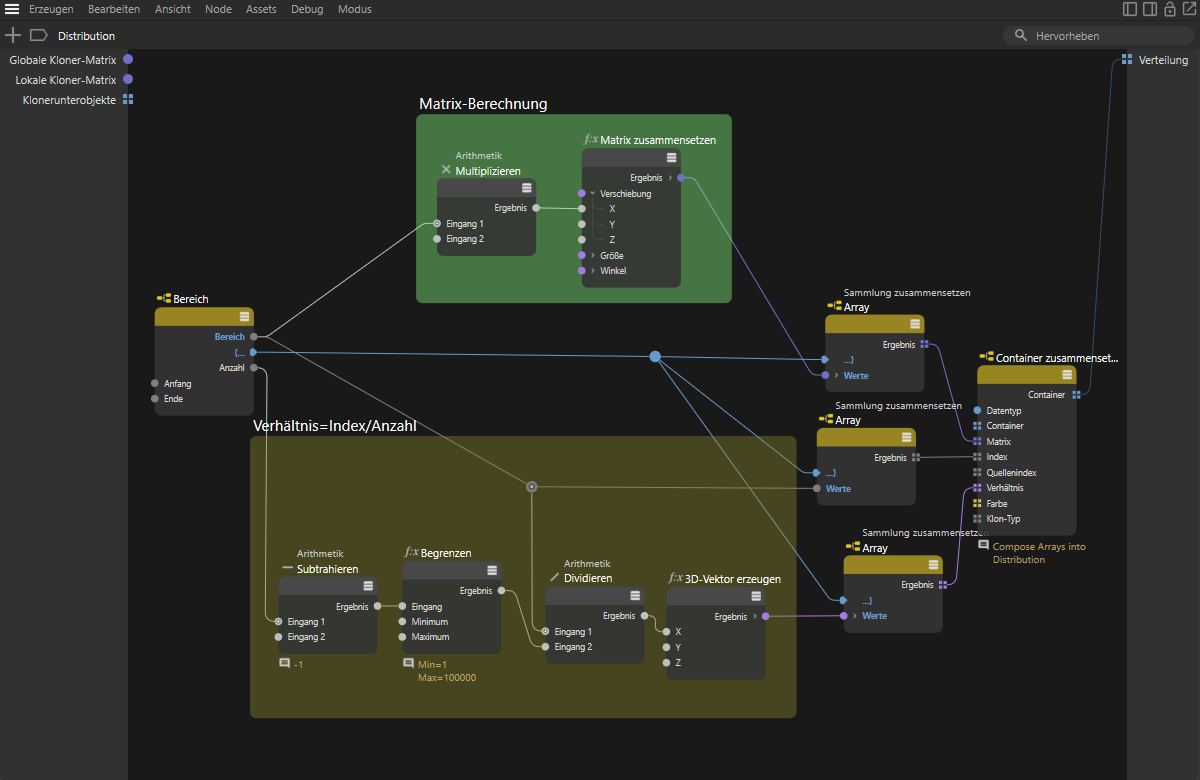 Ein Bereich-Node gibt nacheinander die gewünschten Indexnummern der Klone aus. Der grün hinterlegte Bereich steht stellvertretend für die individuelle Berechnung von Positionen, Rotationen oder Größen aller Klone in Abhängigkeit von der gerade am Bereich-Node zur Verfügung gestellten Bereich-Ausgabe. Über einen Sammlung zusammensetzen-Node können diese Einzelergebnisse zu einem Array zusammengefügt werden, das dann als Matrix-Array an der Verteilung verwendet wird.