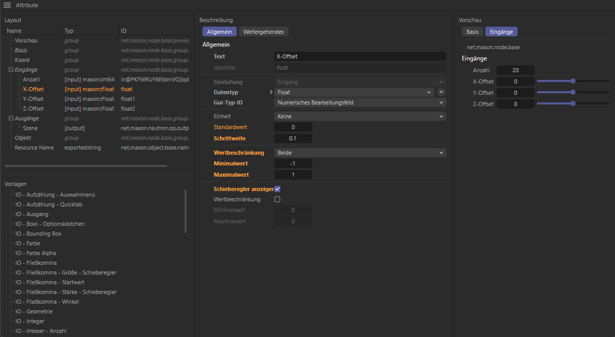 Durch einen Rechtsklick in den Eingangsbereich der Kapsel rufen wir schließlich noch Resource bearbeiten... auf, um den Resource-Editor zu öffnen. Dort können dann in der linken Liste die Eingänge so per Drag&Drop umsortiert werden, wie Sie dem Nutzer innerhalb der Klon-Objekt-Einstellungen angezeigt werden sollen, also z. B. mit dem Anzahl-Wert zu oberst, gefolgt von den drei neuen Offset-Werten. Im mittleren Teil des Resource-Editors können Sie nun noch den Standardwert, die Minimal- und Maximalwerte, sowie einen optionalen Schieberegler für das Interface der drei Offset-Werte konfigurieren. Die folgende Abbildung zeigt einen Vorschlag für die Konfiguration am Beispiel des X-Offset-Werts. Der Resource-Editor kann nach getaner Arbeit einfach geschlossen werden.