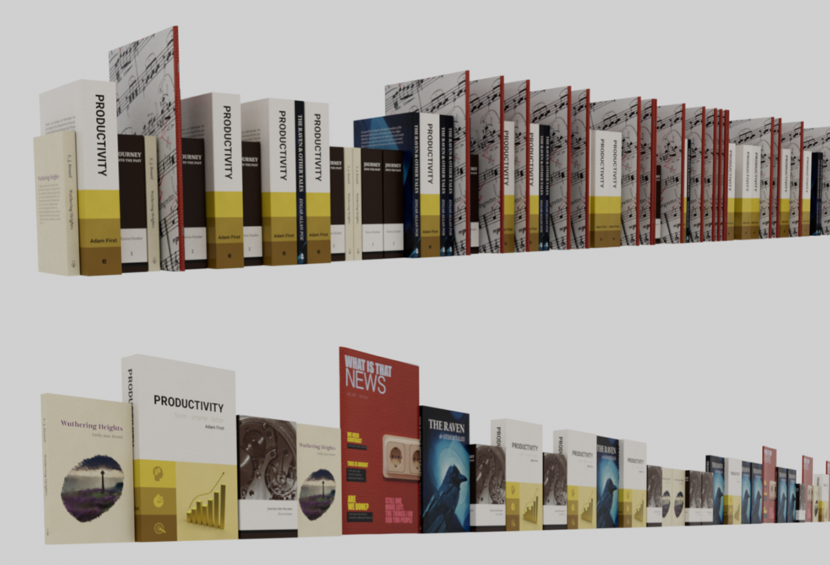 Diese unterschiedlich großen Bücher wurden über eine Nodes-Verteilung automatisch so platziert, dass es keine Abstände dazwischen gibt und alle Bücher auf einer Ebene stehen. Dies ist möglich durch die Auswertung der Bounding Box jedes verwendeten Objekts, was so bei den klassischen Verteilungsmodi eines Klon-Objekts nicht möglich wäre.