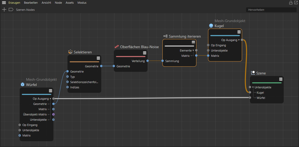 Eine Möglichkeit, eine Noise-basierte Verteilung auf einer Oberfläche zu erstellen. Die gleiche Schaltung wurde auch für die nachfolgenden Darstellungen verwendet.
