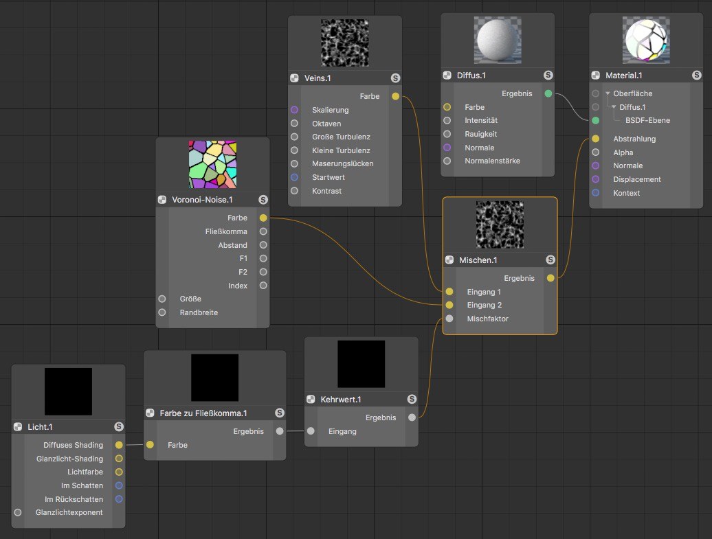 Durch den "Mischen"-Node lässt sich zwischen zuvor definierten Grenzwerten weich abmischen. In diesem Beispiel wird die Helligkeit der diffusen Oberflächenschattierung zur Steuerung eines Leuchten-Effekts verwendet.