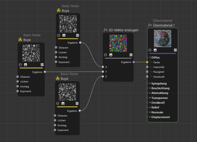 Durch das Kombinieren von drei unterschiedlichen Noise-Nodes zu einem Vektor, lassen sich einfach Zufallsfarben generieren.