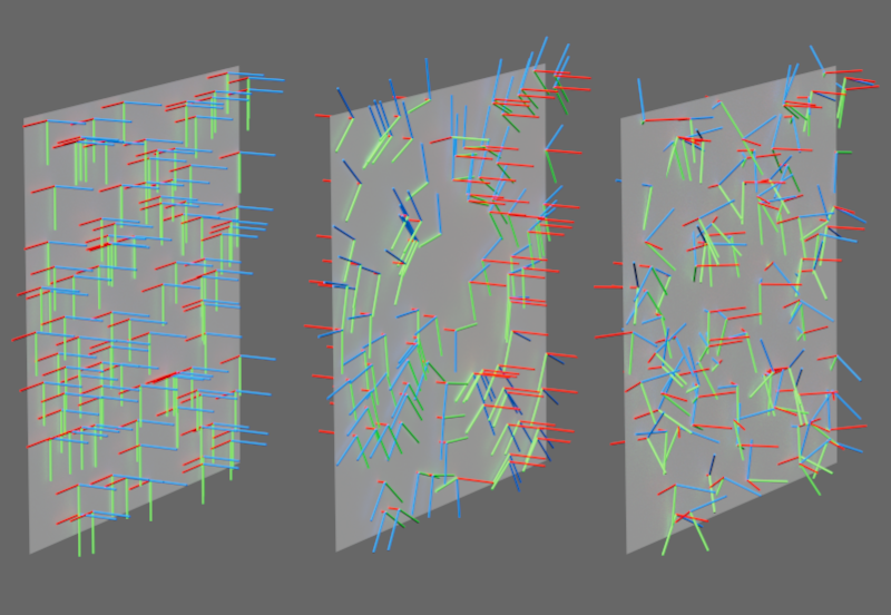 - Zufällig: Die Ausrichtung basiert nur auf dem Startwert des Emitters und erfolgt für jedes Partikel zufällig.