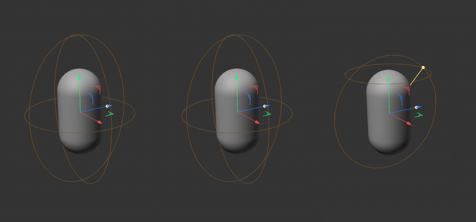 Jedes Partikel enthält ein vollständiges Achsensystem und kann daher nicht nur eine Position, sondern auch Rotationen und Ausrichtungen wiedergeben. Dies ist wichtig, damit z. B. ein Vogelschwarm mit Partikeln animiert werden kann, bei dem alle Vögel automatisch mit Kopf und Schnabel voran fliegen und passend ausgerichtet werden. Die Ausrichtung der Partikel kann z. B. mit dem AusrichtenModifikator auch während des Flugs durch den Raum automatisch nachgeführt werden, damit z. B. eine bestimmte Partikel-Achse immer in Flugrichtung zeigt. Hier jedoch geht es um die Startausrichtung der Partikel im Moment ihrer Entstehung am Emitter.