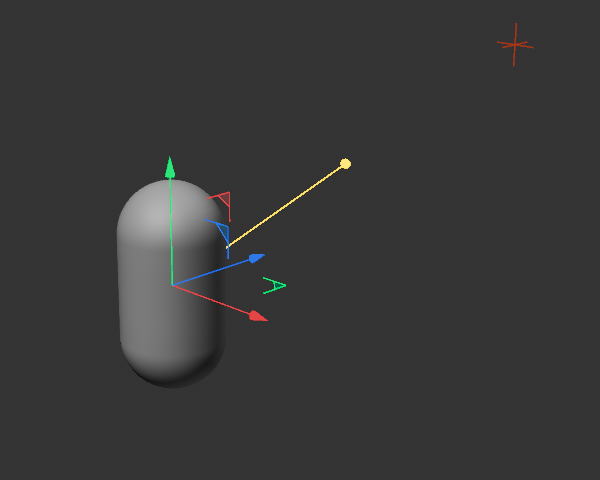 - Ziel: Sie können ein Objekt angeben, auf dessen Position die Abgaberichtungen der Partikel zielen. Wie in der folgenden Abbildung zu erkennen, passt sich dadurch die Richtung des Geschwindigkeit-Anfassers automatisch so an, dass dieser auf das zugewiesene Ziel-Objekt ausgerichtet wird (hier als rötlicher Stern dargestellt). So lässt sich auch dann die Abgaberichtung der Partikel erahnen, selbst wenn das Ziel-Objekt gerade nicht in der Ansicht zu sehen ist.